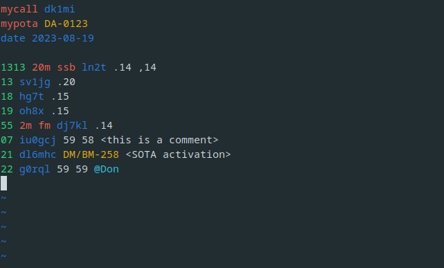 Vim syntax plugin for writing Fast Log Entry (https://df3cb.com/fle/) compatible log files in Vim.