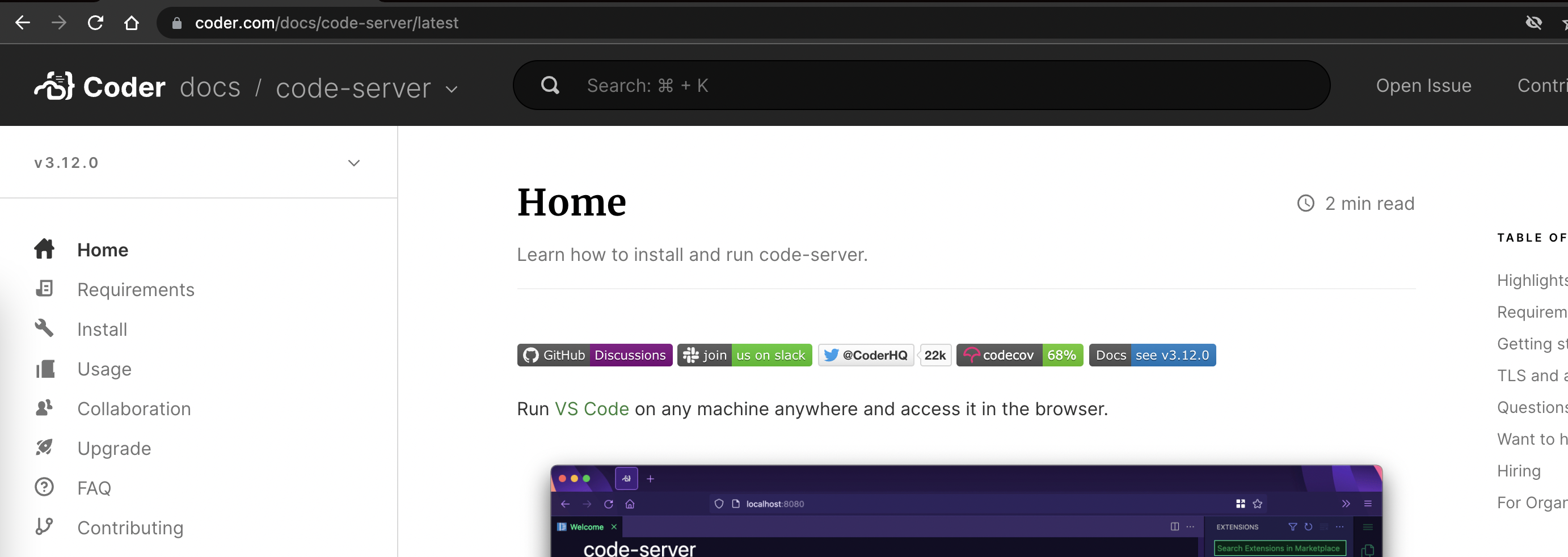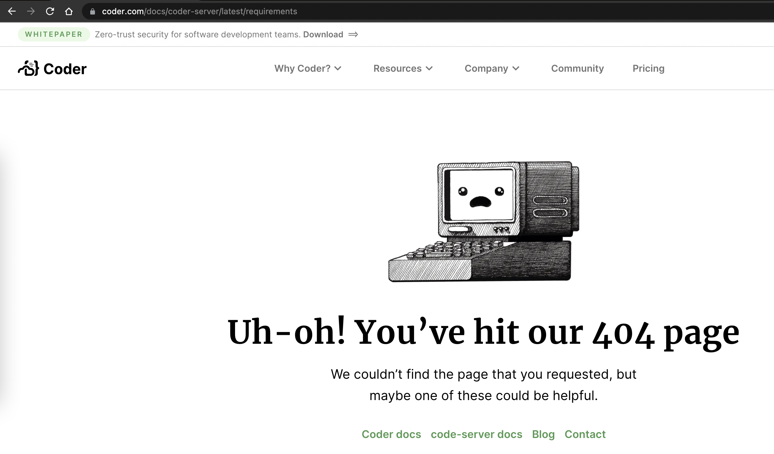 When hitting any of the links in the left menu bar (screenshot above), they direct to URLs of the form https://coder.com/docs/coder-server/latest/ (screenshot below) instead of https://coder.com/docs/code-server/latest/ which looks to be the correct address. Look closely at coder-server versus code-server.