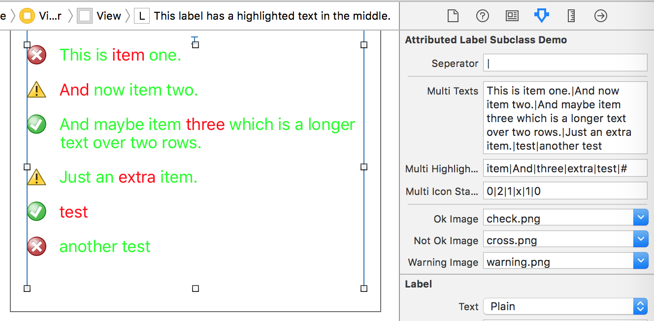 }There is also an AttributedLabel class which derives from UILabel which makes it easy to create your own custom control that includes support for interfacebuilder. If you put a lable on a form in interfacebuilder and set it's class to your subclass (AttributedLabelSubclassDemo in the sample below) Then you will see the text formated in interface building according to what you have implemented in the configureAttributedLabel function. Here is a sample where a highlightText property is added so that a text can be constructed where that part is highlighted.