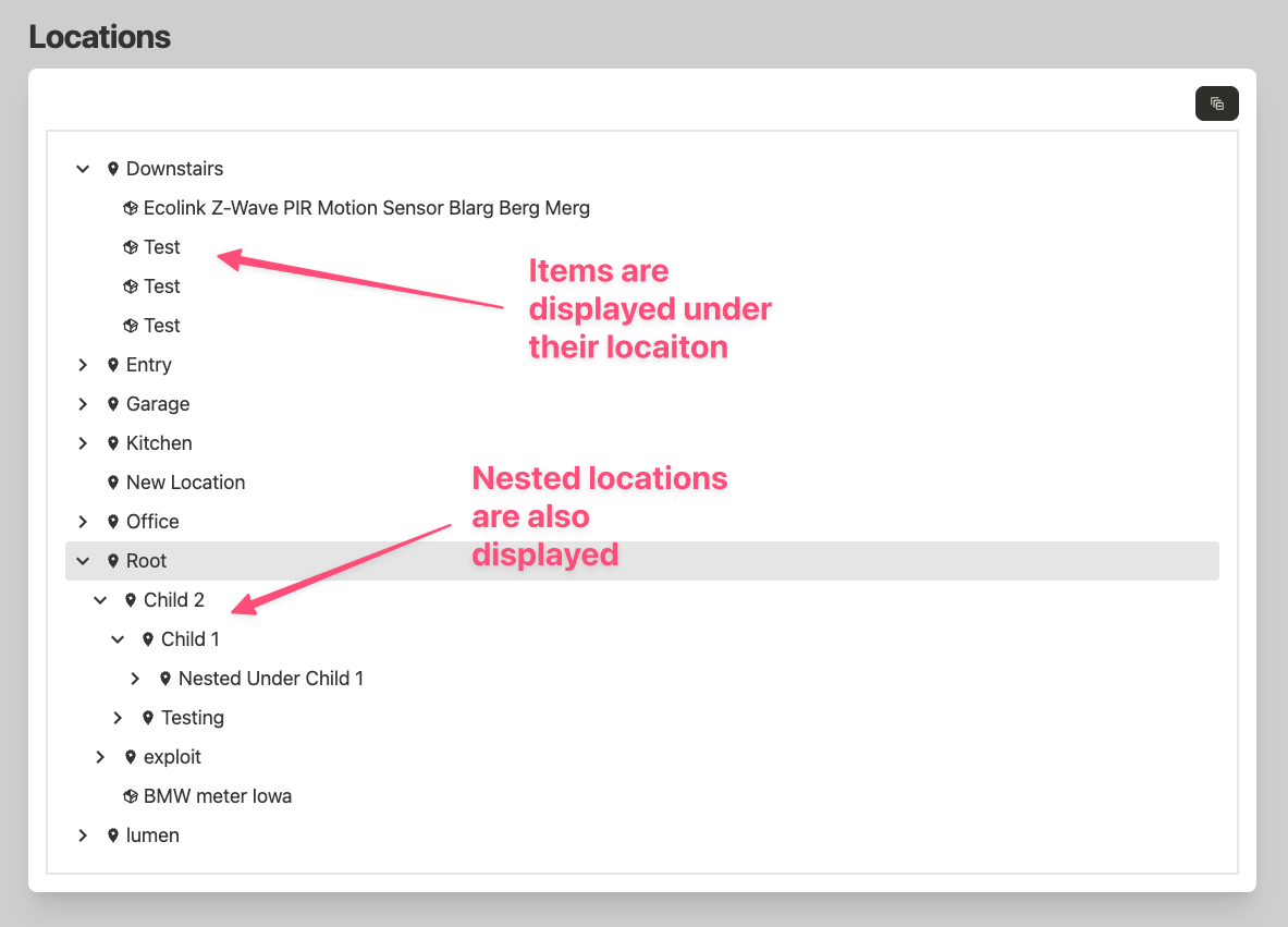 * location tree API * test fixes * initial tree location elements * locations tree page * update meta-data * code-gen * store item display preferences * introduce basic table/card view elements * codegen * set parent location during location creation * add item support for tree query * refactor tree view * wip: location selector improvements * type gen * rename items -> search * remove various log statements * fix markdown rendering for description * update location selectors * fix tests * fix currency tests * formatting