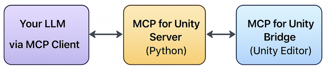 MCP for Unity 使用与 Unity 的 C# 脚本绑定的 Python MCP 服务器来实现工具功能。如果您想使用自己的工具扩展功能,请参阅 CUSTOM_TOOLS.md 了解如何操作。