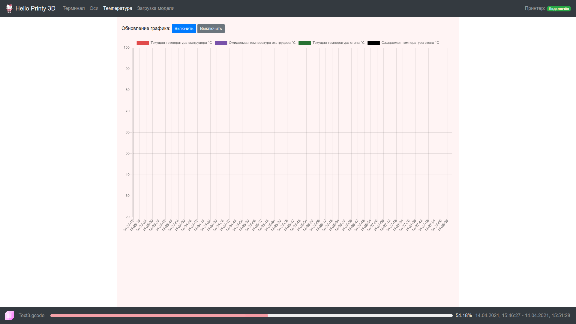 - Температура. На графике показываются реальные температуры и температуры, до которых планируется нагрев, головки и стола за последние 5 минут. Если отсутствует подключение к принтеру, кнопки блокируются.