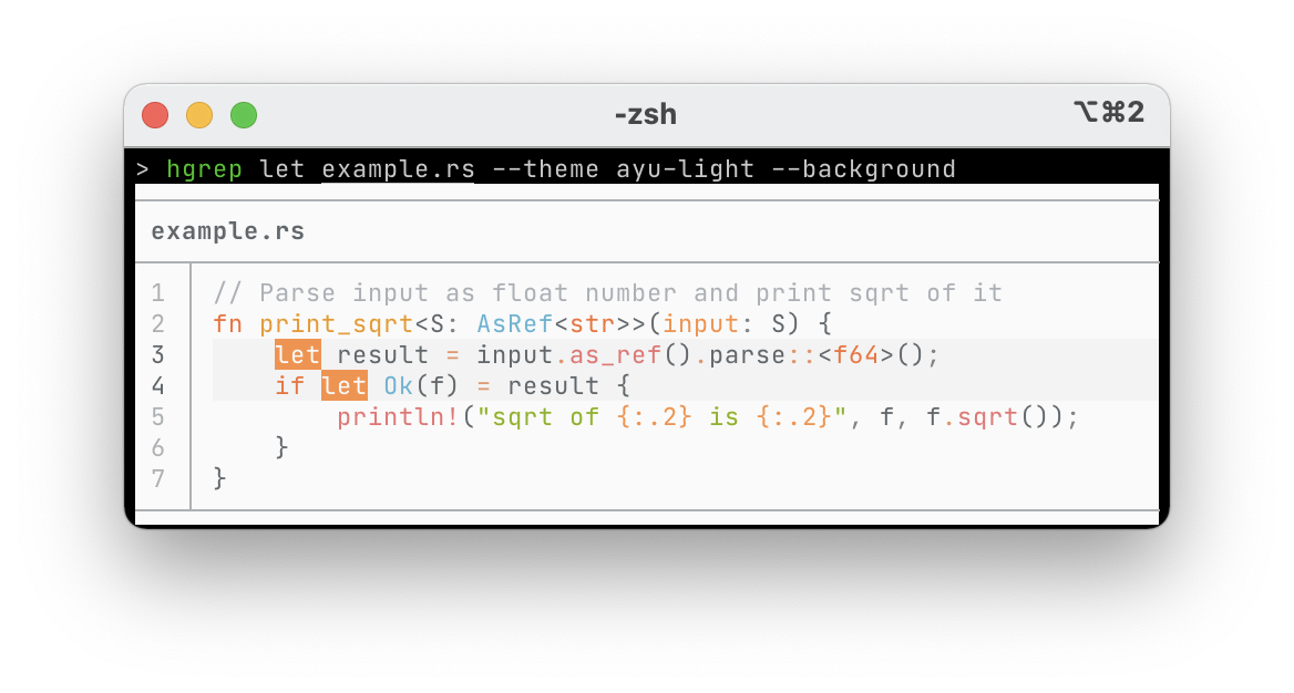 rg -nH pattern paths... | hgrep [options...]hgrep provides two printers to print match results; bat printer and syntect printer. bat printer is a printer